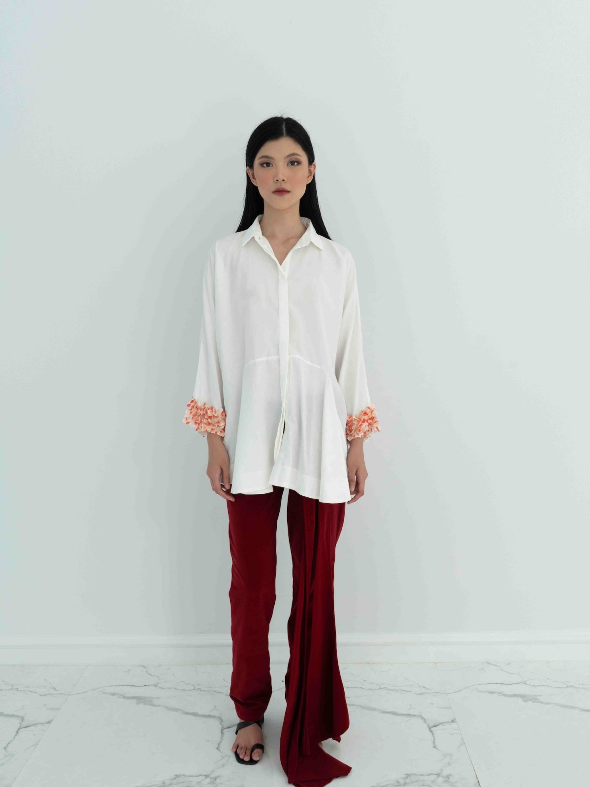 White shirt with sand washed fabric. Features flared accent hem with folded leaf pink, soft pink and apricot blush embellishment on the wrist.