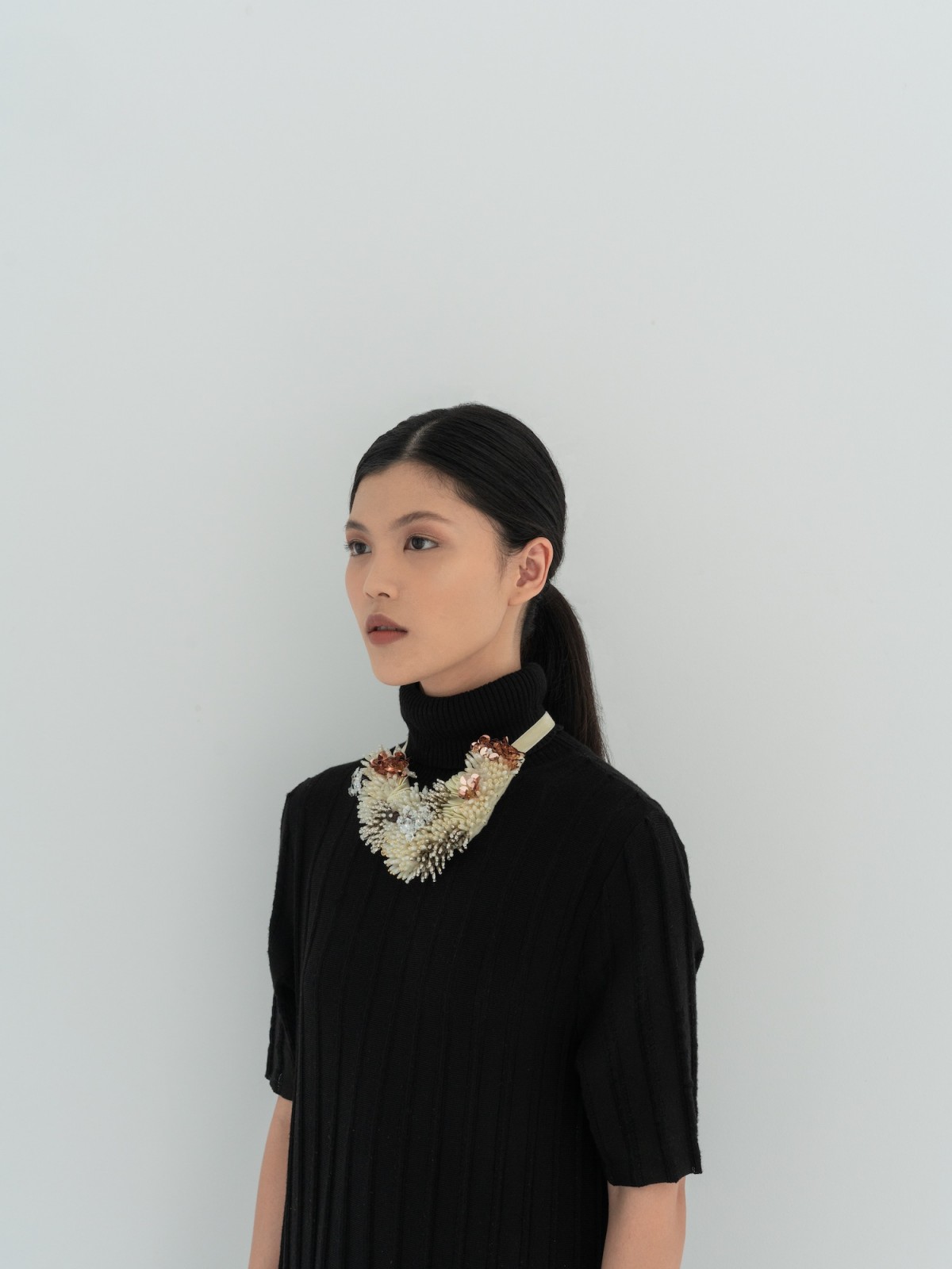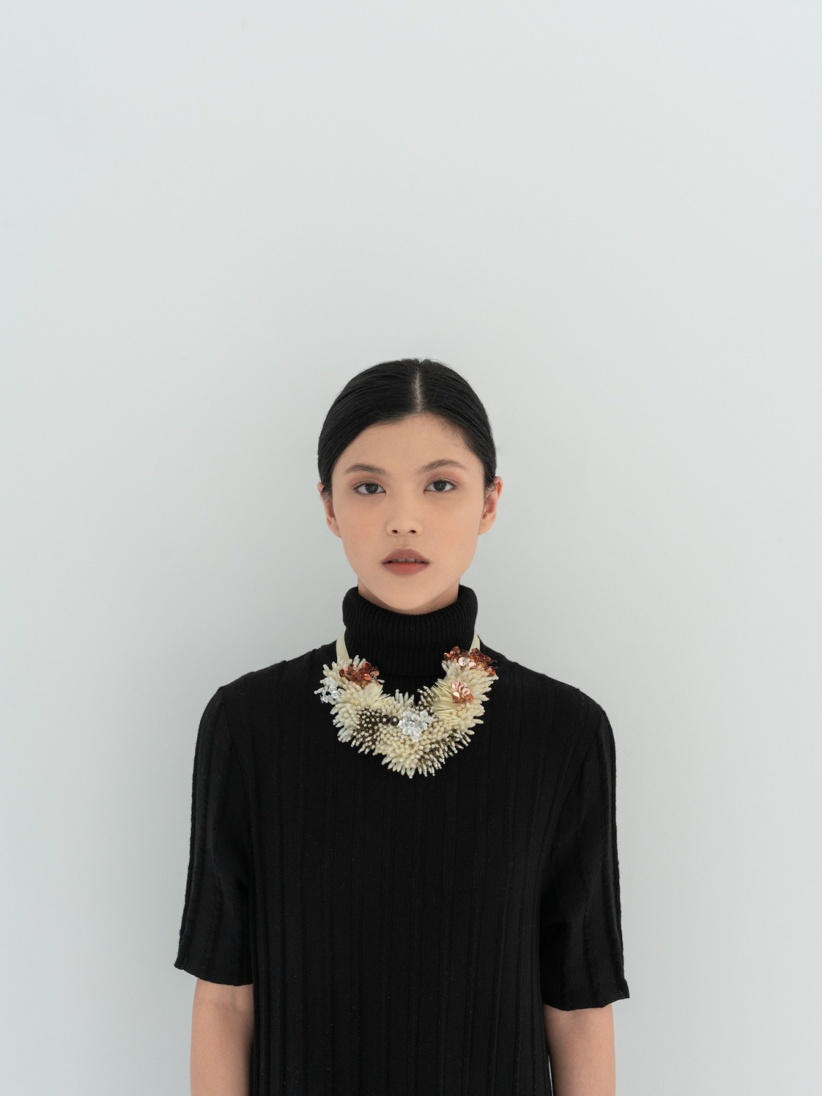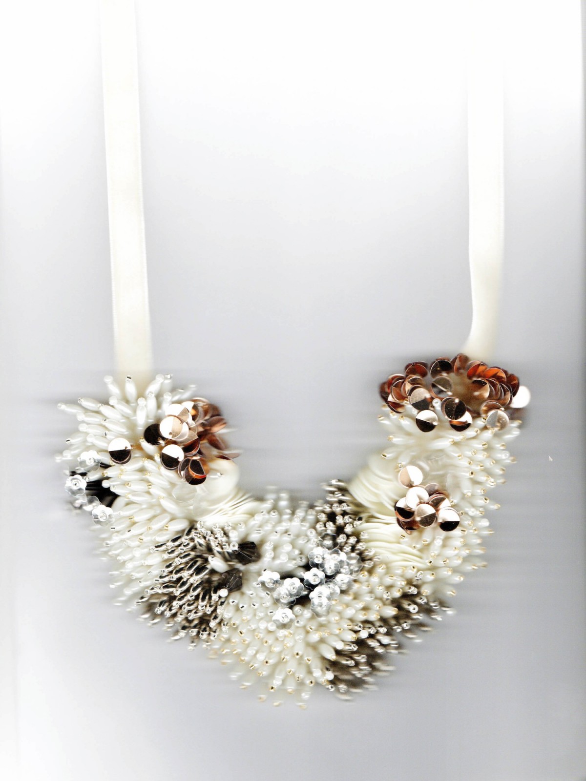 Flannel embellished necklace featuring rounded rose gold and white beads. White and silver rice beads, with velvet lace fastening.