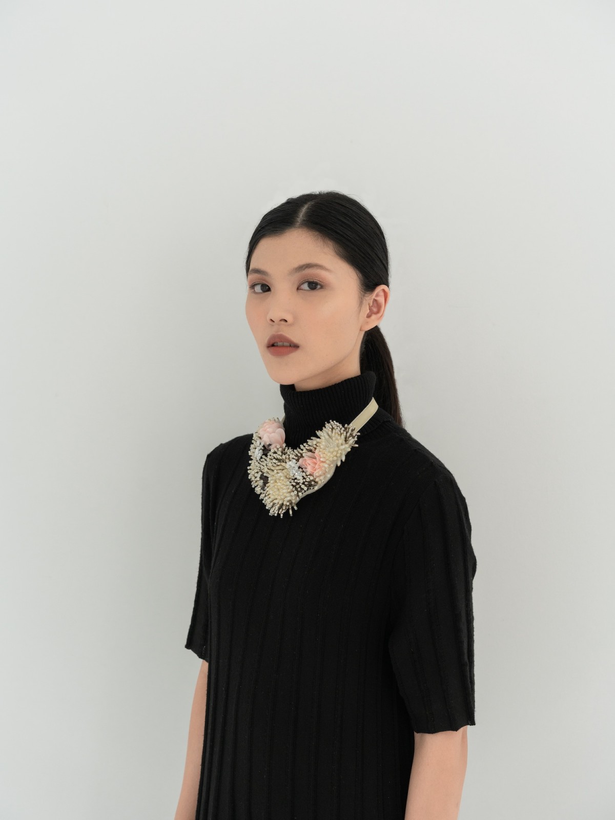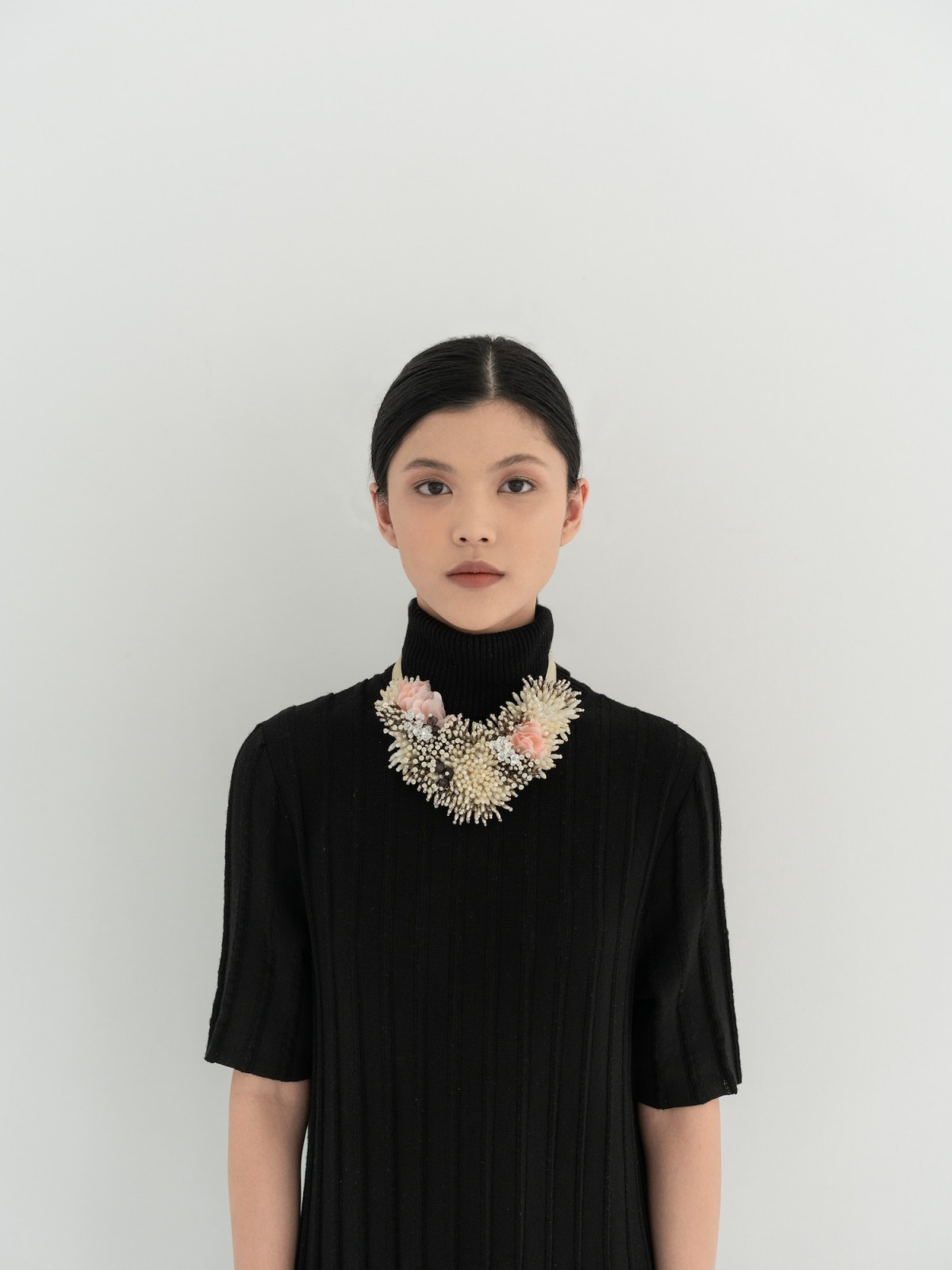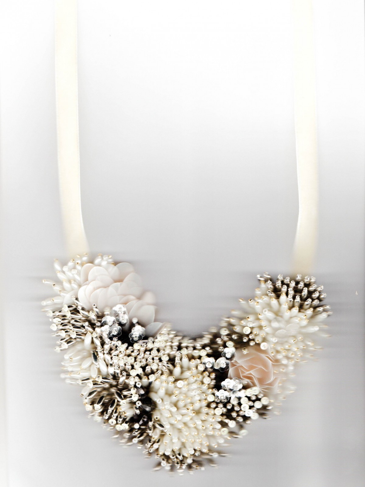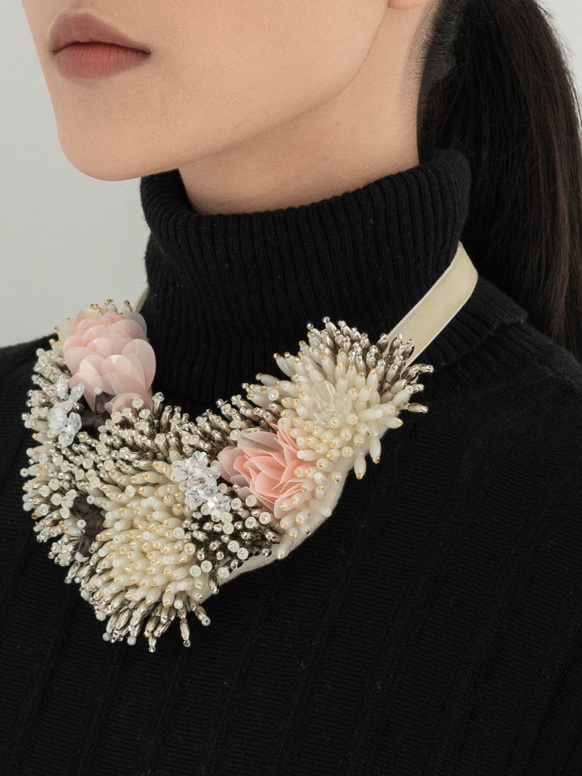 Flannel embellished necklace featuring white and silver rice beads, pipe shaped beads in hues of navy, oval shaped pink transparent beads, with velvet lace fastening.