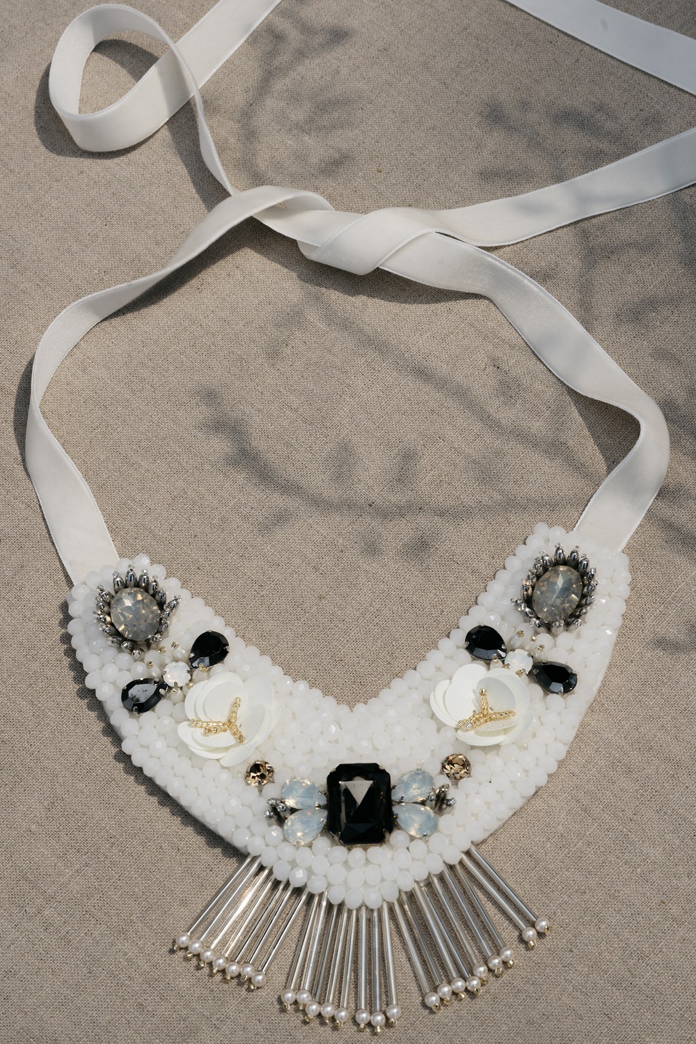 Flannel embellished necklace featuring white crystal with grey and white stones, white flowery beads, silver fringe, with velvet lace fastening.