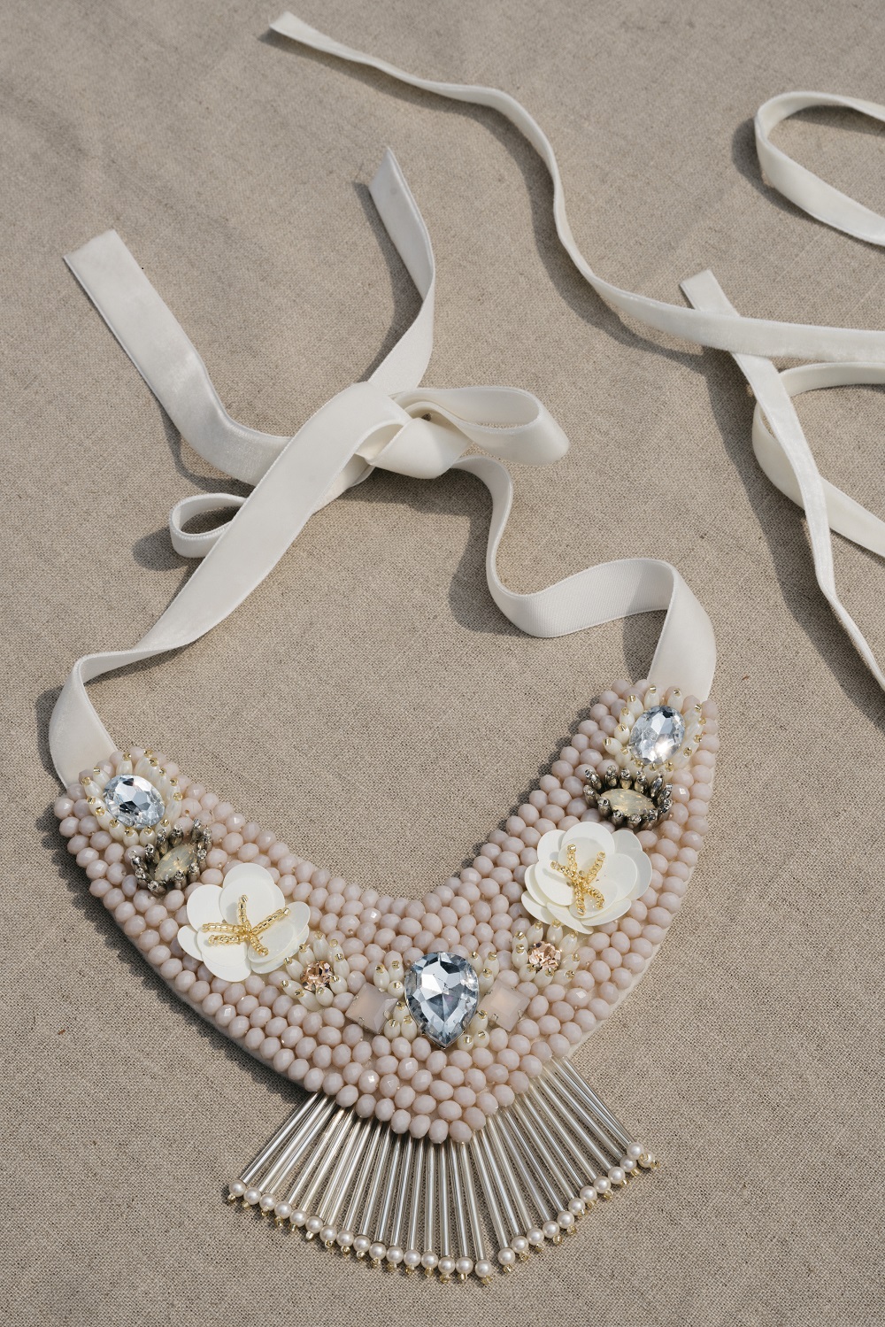 Flannel embellished necklace featuring nude crystals with white flowery beads, clear and pink stones, silver fringe and velvet lace fastening.
