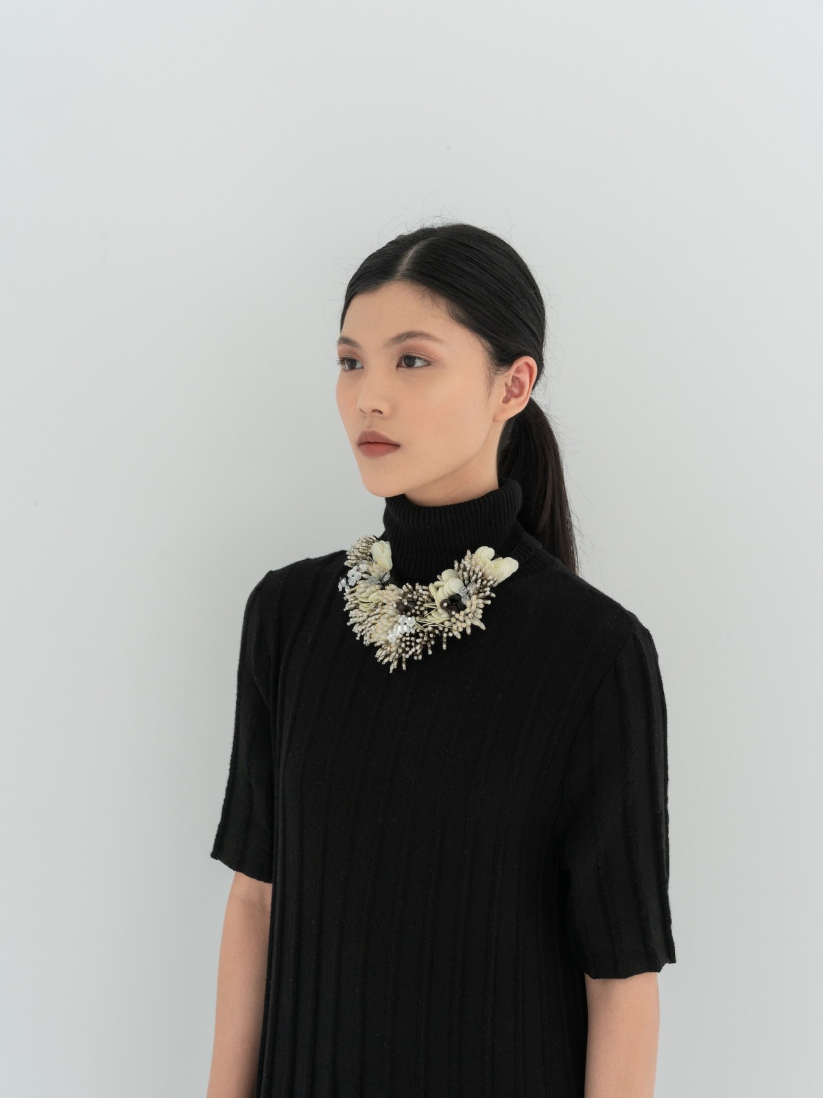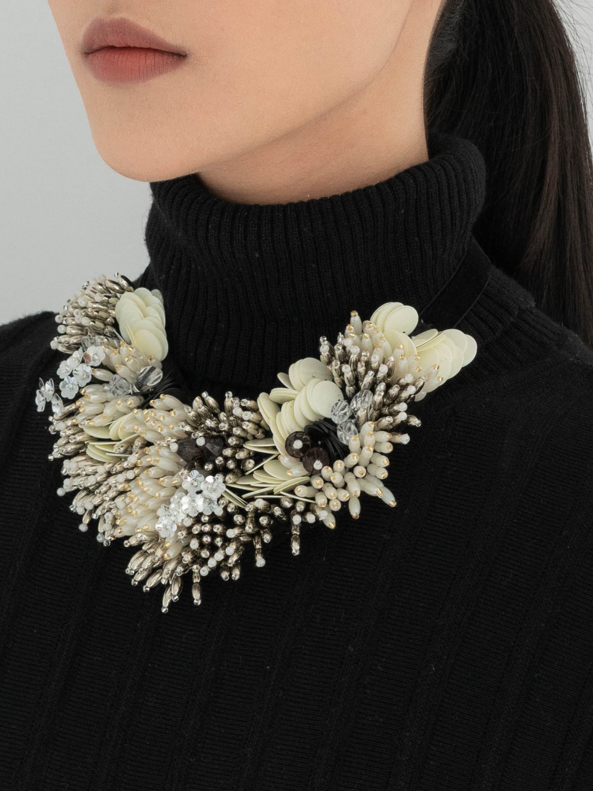 Flannel embellished necklace featuring white and silver rice beads, clear and black acrylic beads, white rounded shape beads, with velvet lace fastening