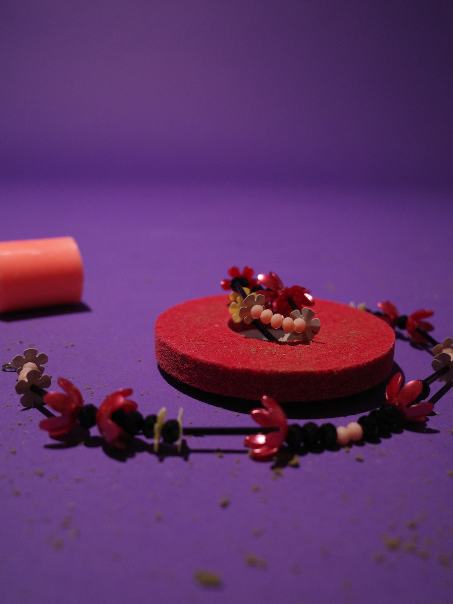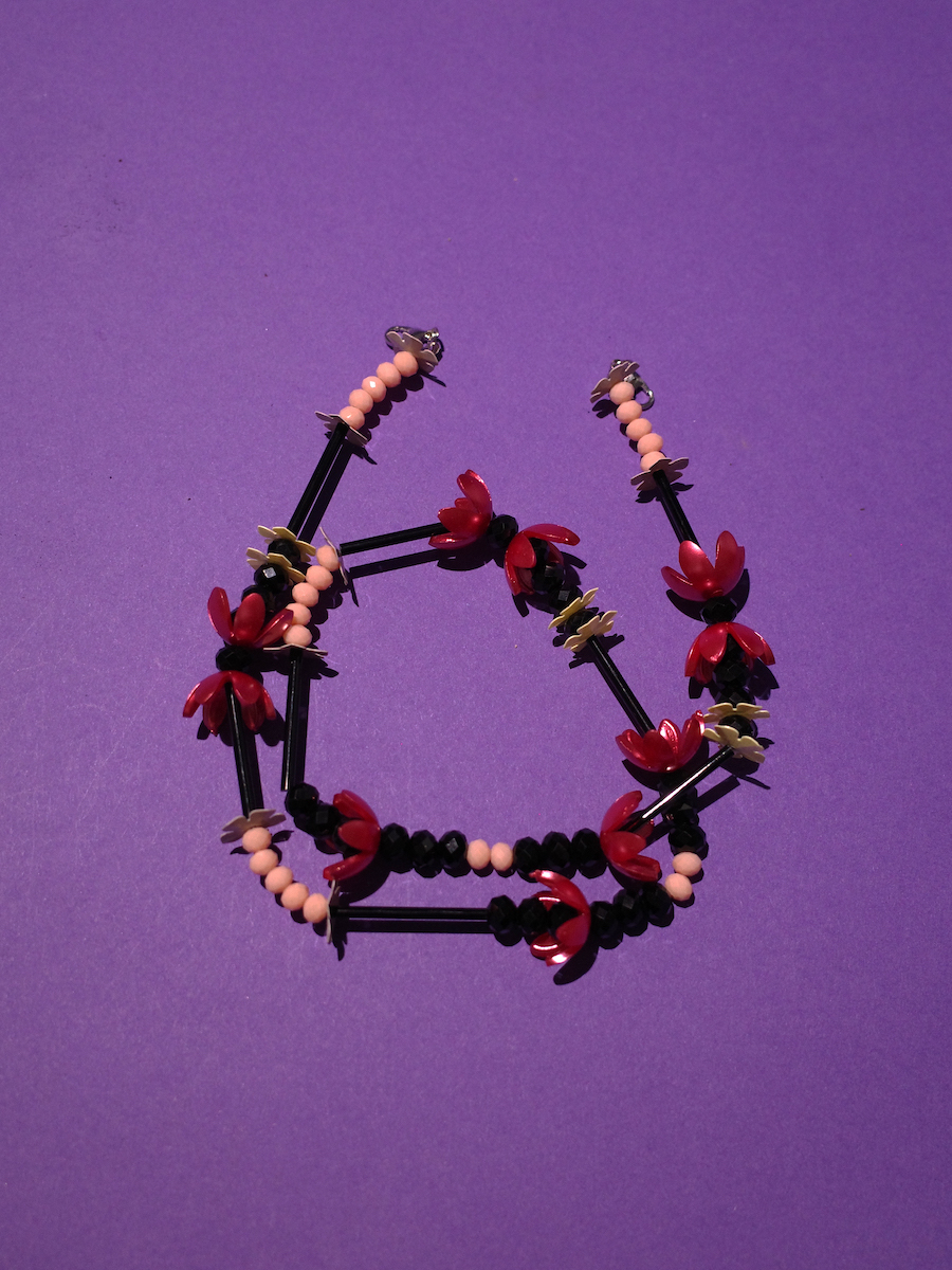 A mask strap that also can be a jewellery accent that consist of black bamboo, peach and black crystal, yellow, and red floral beads
