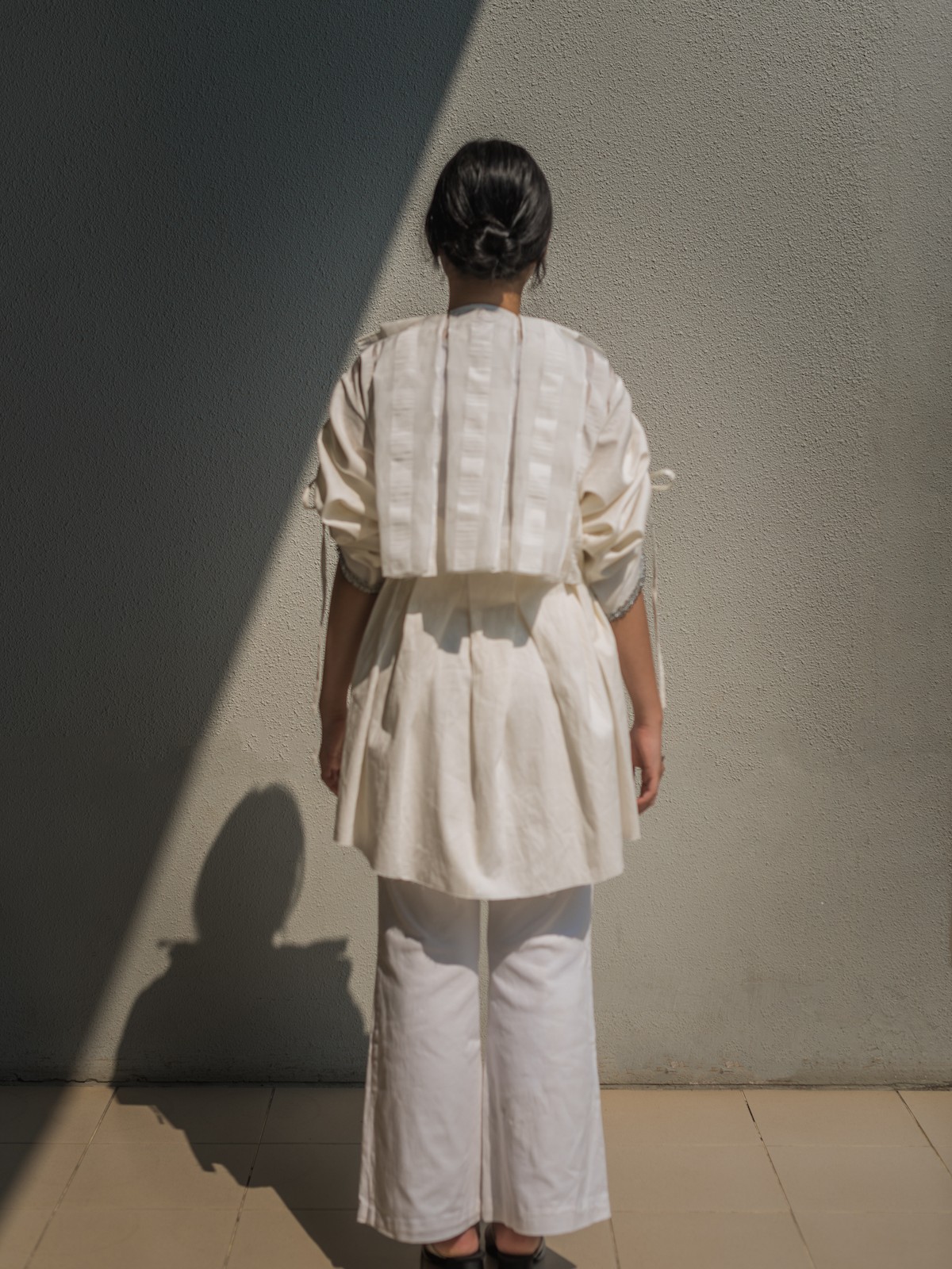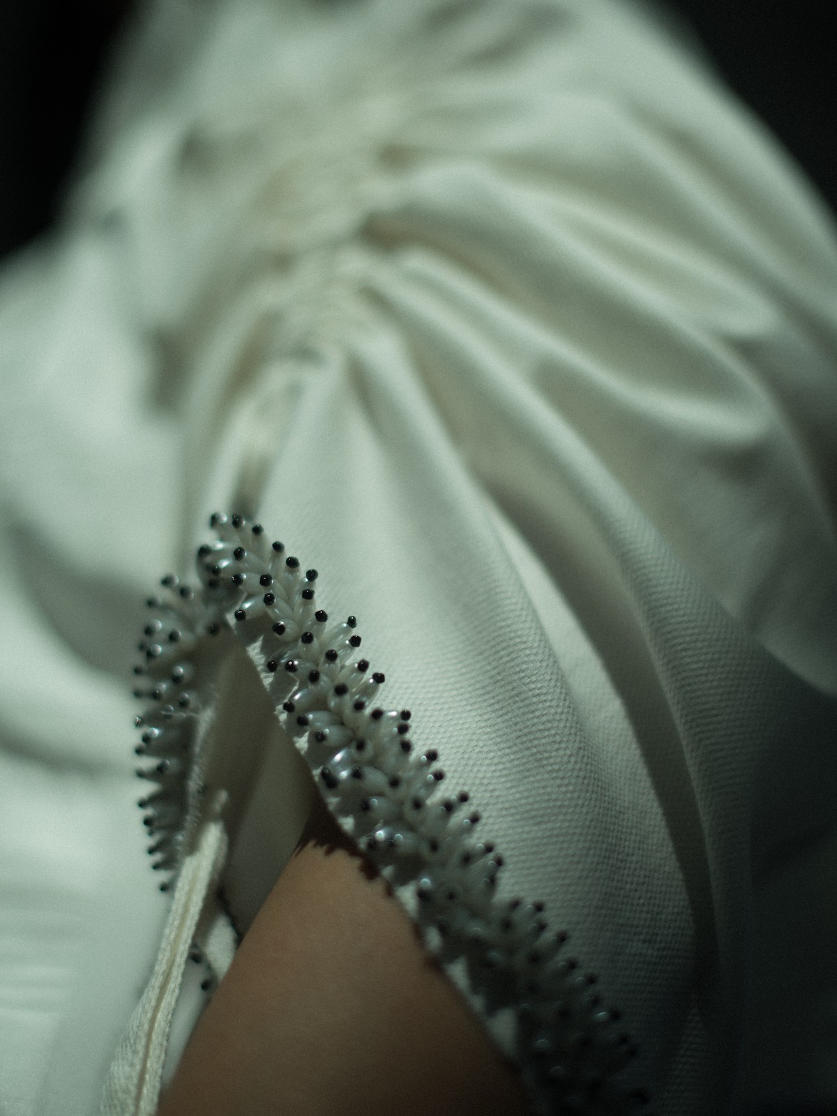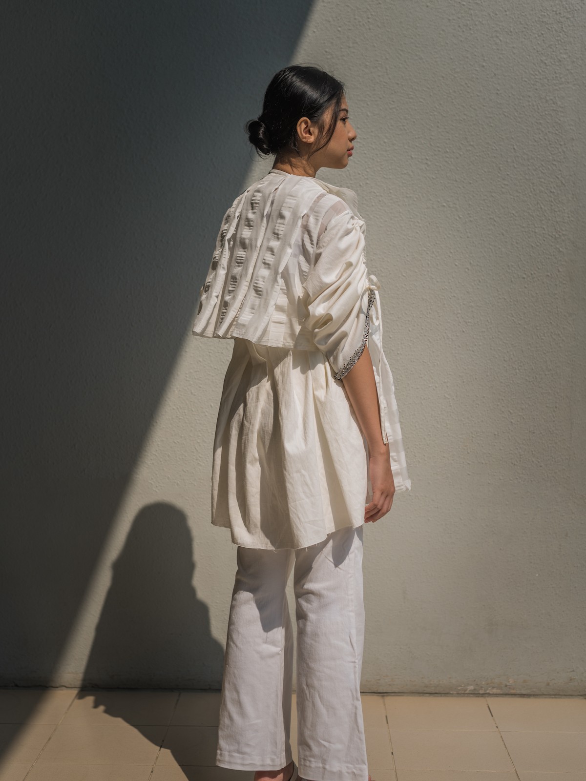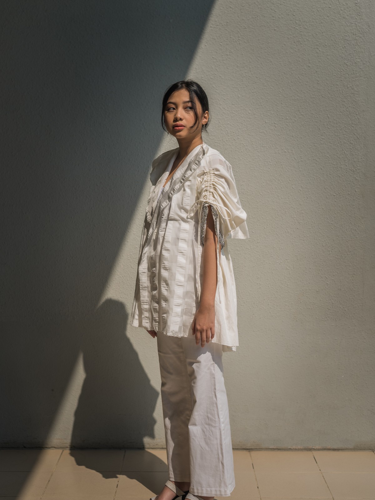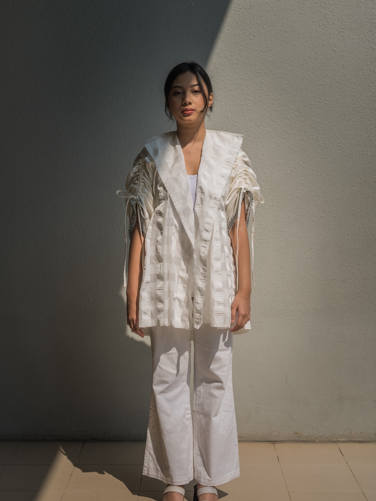 Mixed fabric outer with drawstrings details and spikes beaded appliqué on the wrist. This outer made of twill and polyester fabric.