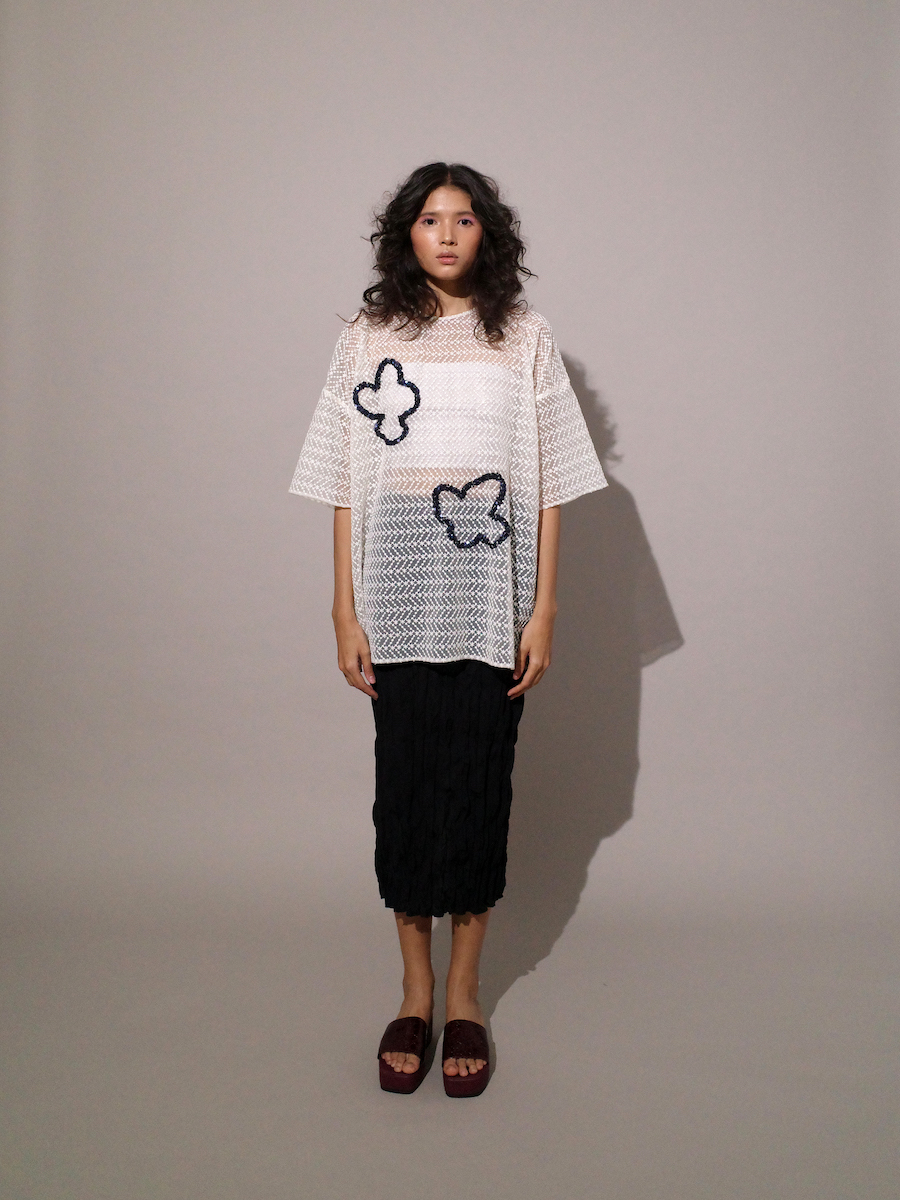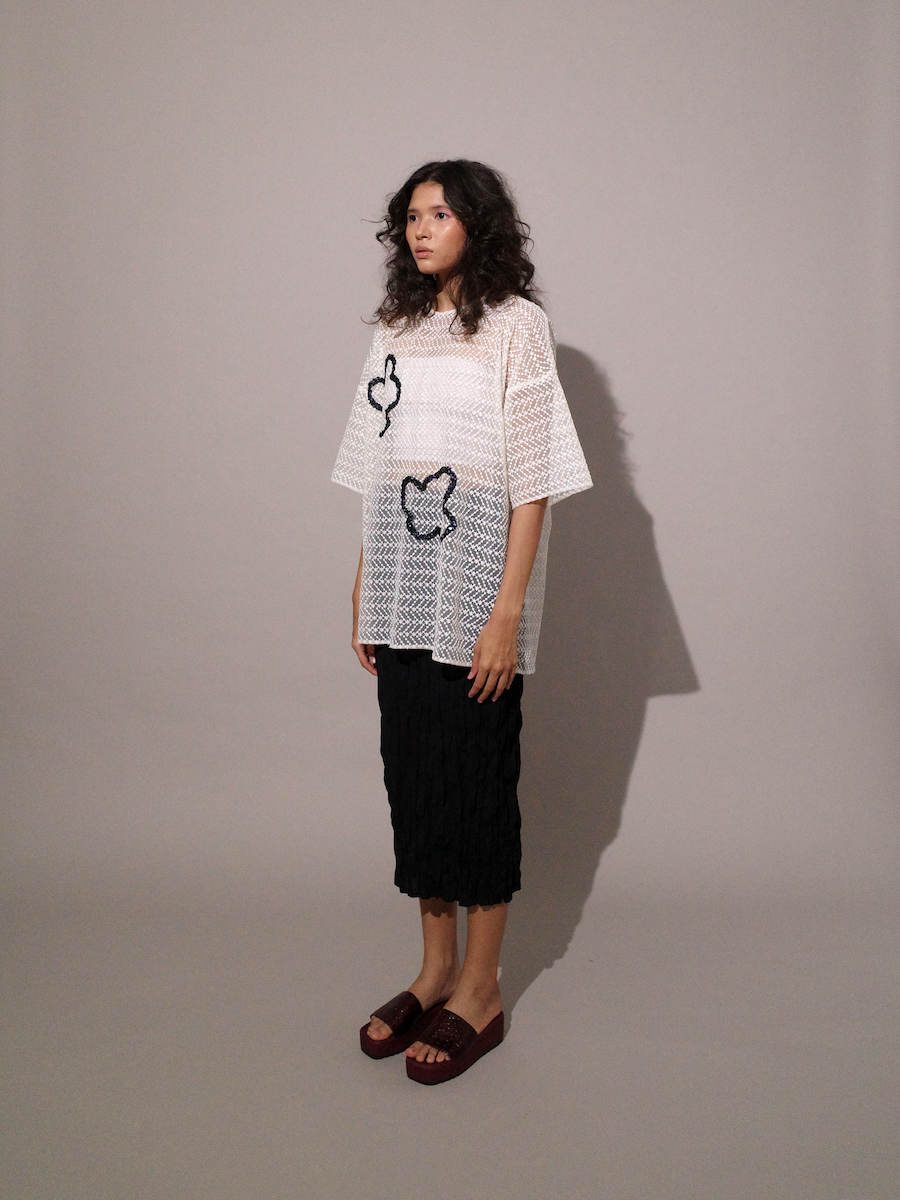 Oversized embroidery tulle top with navy beads.