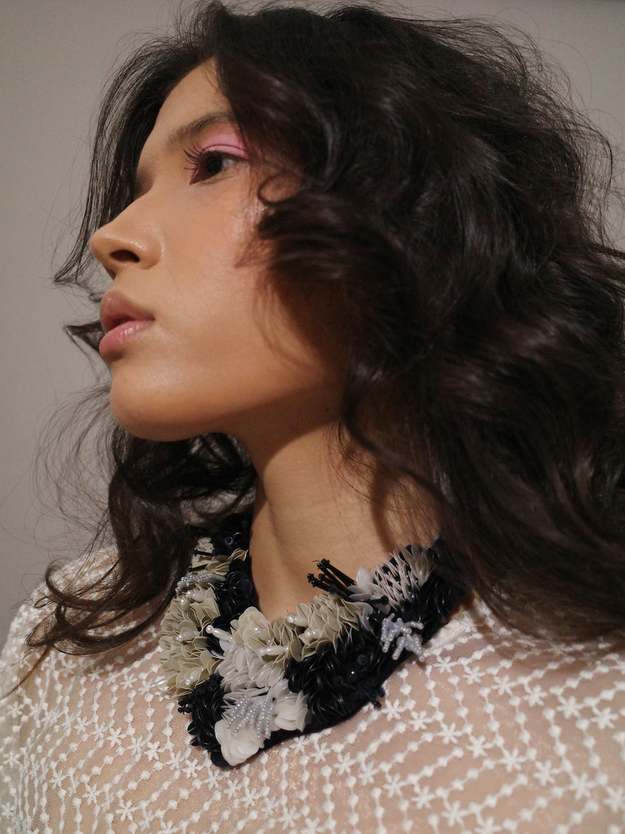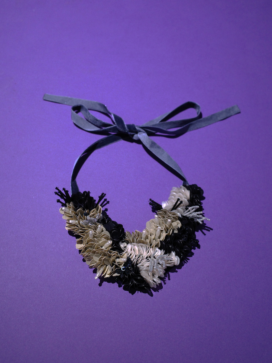 Flannel embellished necklace featuring black, grey, white folded and dots beads with velvet lace fastening.